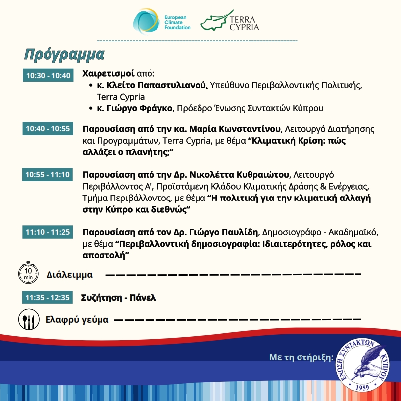 ΕκδηλώσειςΗΜΕΡΙΔΑ: ΜΜΕ ΚΑΙ ΚΛΙΜΑ 10/11/2025 Εκδηλώσεις ΗΜΕΡΙΔΑ: ΜΜΕ ΚΑΙ ΚΛΙΜΑ FacebookTwitterWhatsAppLinkedinEmailPrintViber ΡΟΗ ΑΝΑΚΟΙΝΩΣΕΩΝ ΚΟΠΗ ΒΑΣΙΛΟΠΙΤΑΣ ΕΣΚ 2025 07/01/2025 Εργαστήρι για δημοσιογράφους με θέμα «Παραπληροφόρηση, τεχνικές και εργαλεία επαλήθευσης περιεχομένου» 06/09/2024 Εκδήλωση “Η Δύναμη των Λέξεων: Αναγνώριση & Αντιμετώπιση της Ρητορικής Μίσους” 04/06/2024 Ημερίδα: «Κυπριακή Δημοσιογραφία: Θεσμική υπόσταση, θεωρητική τεκμηρίωση, συνδικαλιστική κατοχύρωση» 13/05/2024 ΠΡΟΓΕΥΜΑ ΕΡΓΑΣΙΑΣ ΓΙΑ ΓΥΝΑΙΚΕΣ ΔΗΜΟΣΙΟΓΡΑΦΟΥΣ 27/02/2024 Κοπή βασιλόπιτας ΕΣΚ 2024 26/01/2024 Δημοσιογραφική διαχείριση προσωπικών δεδομένων 16/10/2023